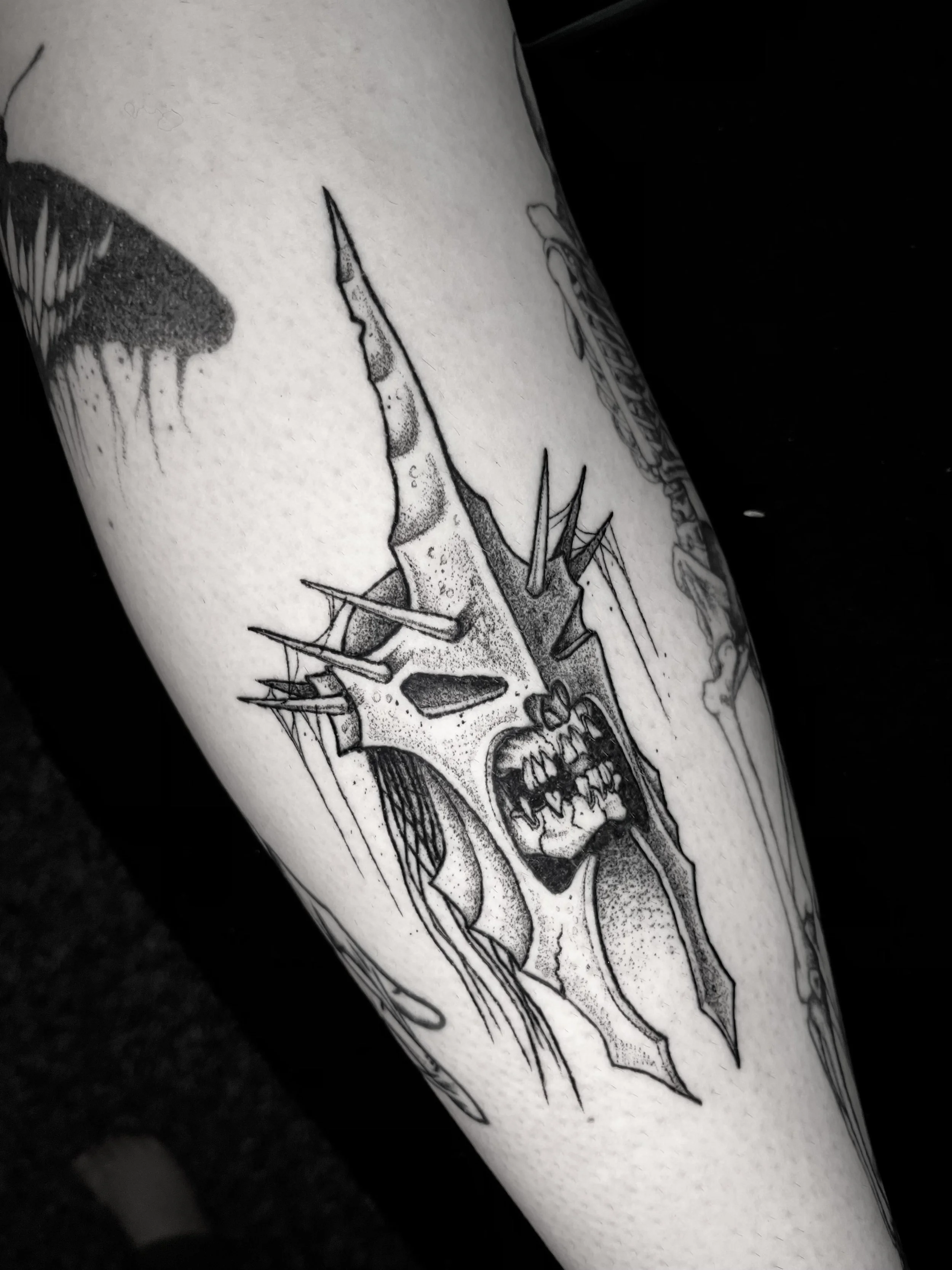 Explore Mark Veitch Godden's unique tattoo art, featuring macabre black work inspired by horror films and video games. Visit our Ashford, Kent studio, email or visit instagram for bookings.